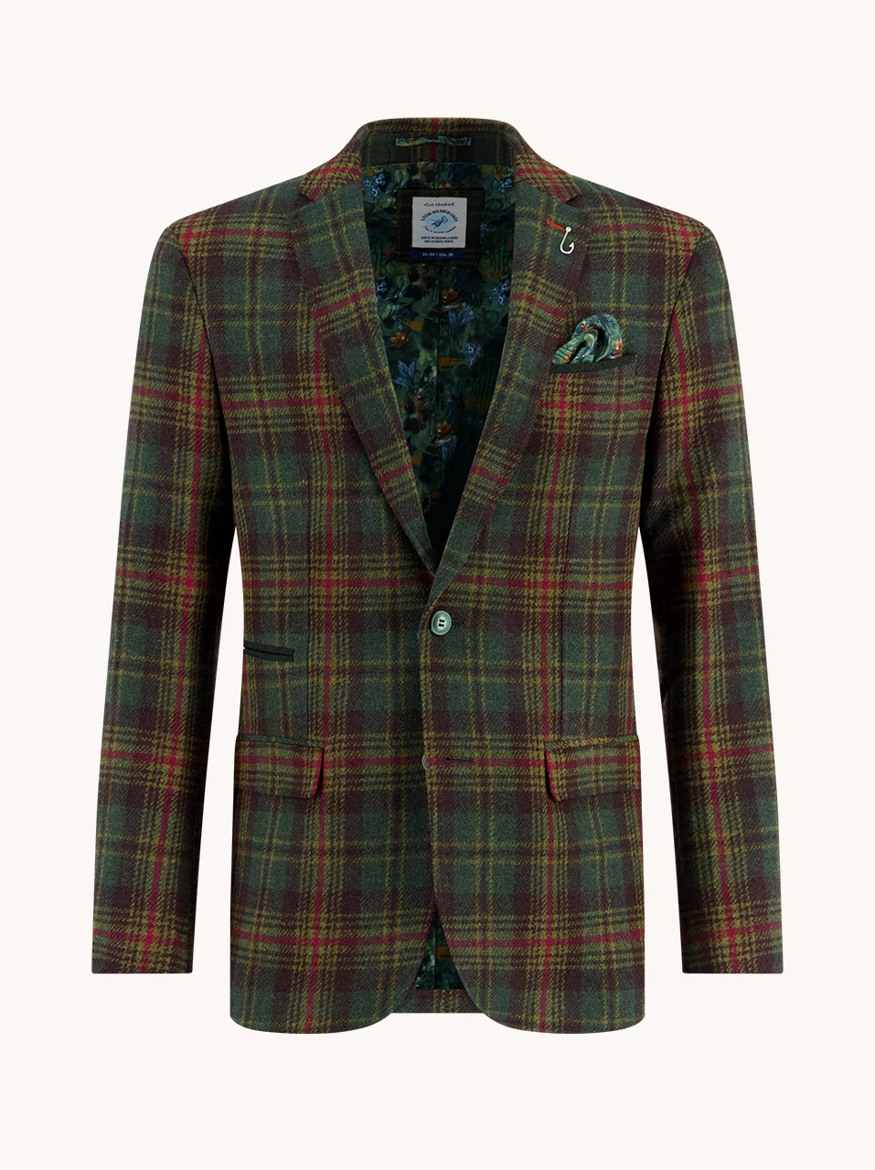 Klasszikus kétgombos, kockás gyapjú sportzakó hátul két sliccel, órazsebbel és díszzsebkendővel.