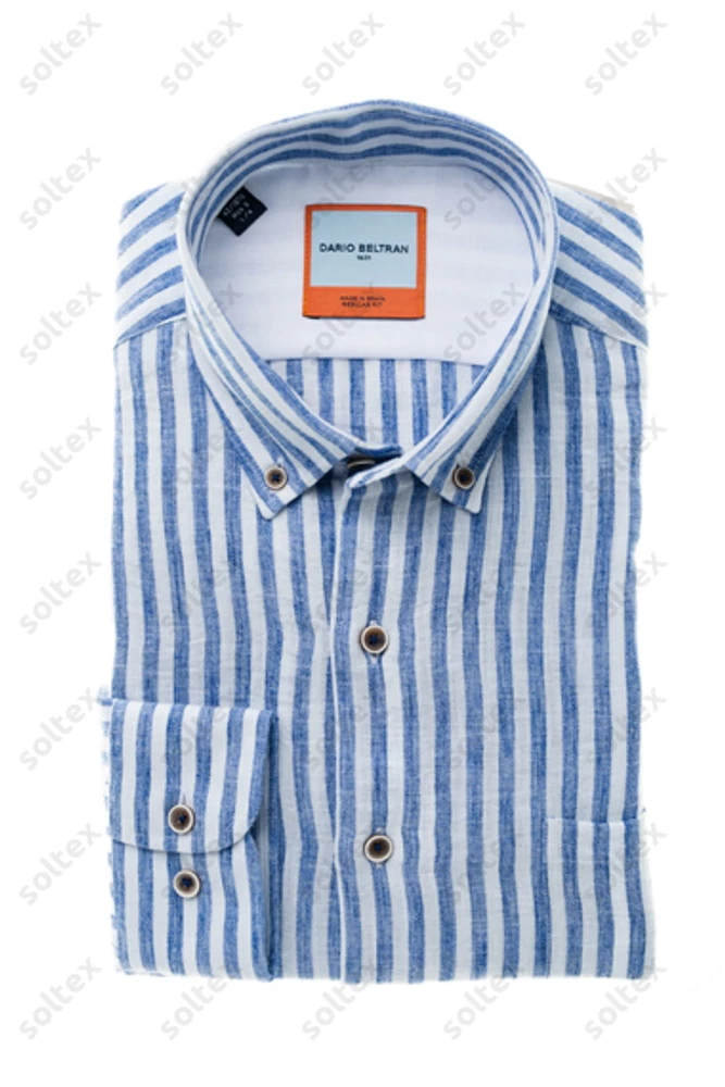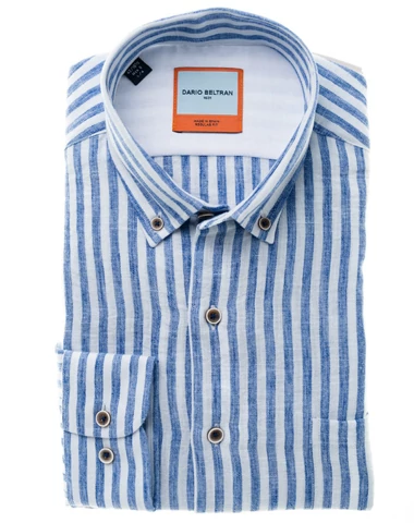 100% pamut anyagból készült len hatású csíkos mintás ing legombolható gallérral és zsebbel.